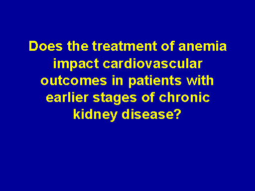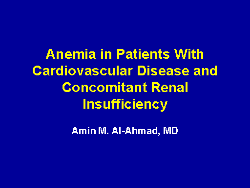 Dr. Kline Bolton: Our next speaker is Dr. Al-Ahmad. We're pleased to have a cardiologist who will brave the nephrology audience. But Dr. Al-Ahmad is going to talk to us about anemia in patients with cardiovascular disease and concomitant renal insufficiency. Thank you.