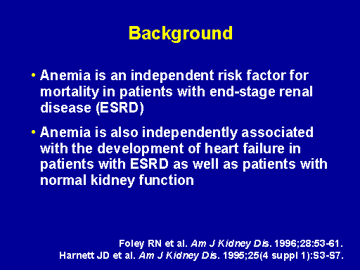 Dr Amin Al-Ahmad: I'd like to thank Ortho Biotech for giving me the opportunity to talk about something I feel is important. As Dr. Parfrey just pointed out to all of us, anemia is an independent risk factor for mortality in patients with end stage renal disease. Anemia has also been independently associated with the development of heart failure in patients with end stage renal disease and to some degree patients with normal kidney function or chronic renal insufficiency.