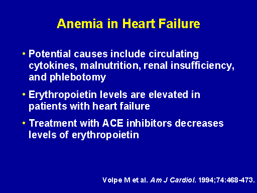 I'd like to stay away from the end stage renal disease patients and talk a little bit about patients who have heart failure and chronic renal insufficiency. Some of the causes for anemia in this patient population include; circulating cytokines, particularly in those patients who are very sick with heart failure, Class III and IV heart failure, malnutrition, renal insufficiency and frequent phlebotomy. Also treatment with ACE inhibitors which is one of the mainstays of the treatment of heart failure can decrease the level of erythropoietin which we know from some animal studies may be elevated in patients who have heart failure.