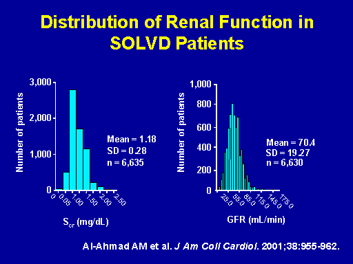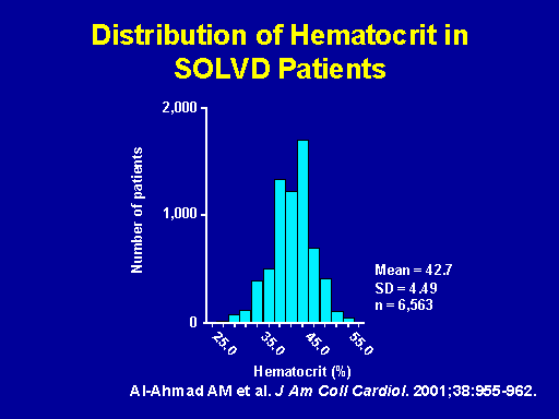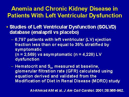 To look at the relationship between anemia, heart failure and renal insufficiency in more depth we evaluated the Studies of Left Ventricular Dysfunction (SOLVD) database. This in close collaboration with some of the nephrologists at our center, Andy Levey and Mark Sarnak. This, as you may know, was the first major randomized controlled trial looking at any ACE inhibitor in a population of patients with LV dysfunction. It was a multicenter study that randomized 6,797 patients to receive either enalapril or placebo and further stratified these patients by whether they were symptomatic ... in other words, whether they had heart failure ... or whether they were asymptomatic. All patients had to have an ejection fraction less than 35 percent.