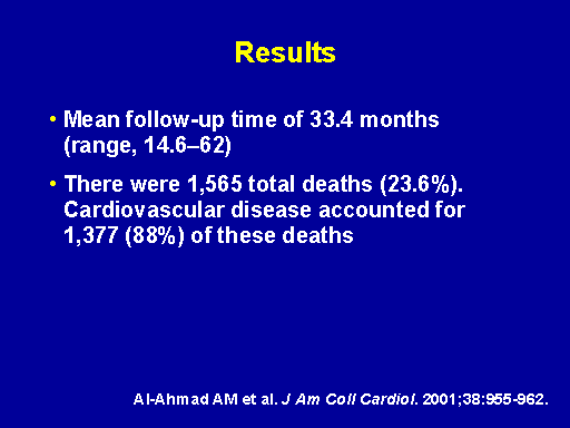 Of note the patient population was primarily male, Caucasian. Twenty percent of these patients had diabetes. About 70 percent of these patients had coronary disease as the cause of their LV dysfunction. At baseline entry into the study both hematocrit and serum creatinine were measured. We calculated GFR based on an equation derived and validated from the MDRD study. Patients were followed for a mean of 33 months and there were approximately 1500 deaths. Of these, 88 percent were cardiovascular. So this for the most part represents cardiovascular mortality.