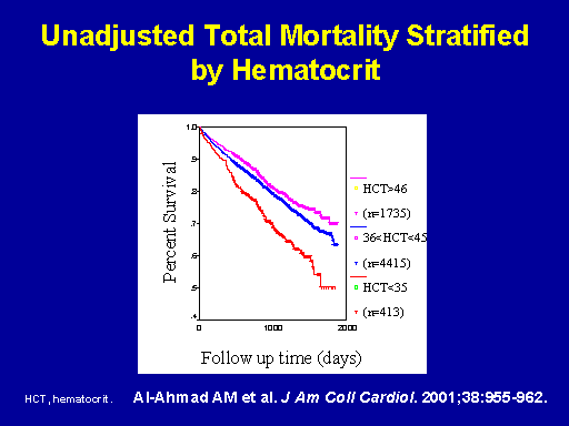 Now, looking at mortality in patients with left ventricular dysfunction stratified by the level of hematocrit you can see that patients who have higher hematocrit levels have improved survival as compared to those patients with lower hematocrit levels. Here hematocrits greater than 46 survived better than hematocrits less than 35 percent.