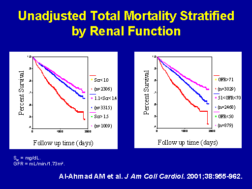 Also if you look at the kidney function as measured by serum creatinine or by predicted GFR, you'll see a very nice distribution with a mean serum creatinine of 1.2 corresponding roughly to a mean GFR of 70.4 ml/min. And one thing I'd like to note is that virtually all cardiology studies exclude patients with renal insufficiency with creatinines greater than 2.5 mg/dl and sometimes even 2.0 mg/dl and that's one of the reasons you don't see any points beyond there.