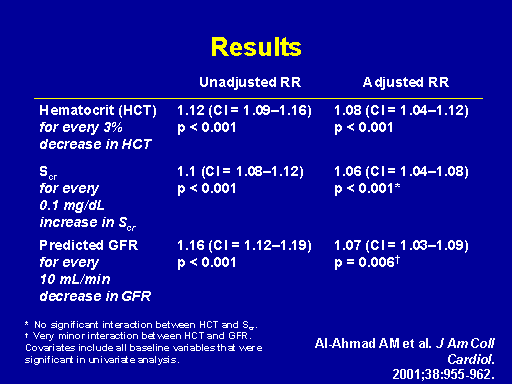Before adjusting for other covariates and confounders we found that for every 3 percent decrease in hematocrit there was a 12 percent unadjusted increased risk for total mortality that was statistically significant. After adjustment there was an 8 percent increased risk again for every 3 percent decrease in hematocrit, also highly statistically significant. For every 0.1 mg/dl increase in the serum creatinine there was a 10 percent increase in mortality. And after adjustment a 6 percent increase in mortality, highly statistically significant. Similarly for predicted GFR a 16 percent increase in mortality was found for every 10 ml/min decrease in GFR; when adjusting for covariates this was a 7 percent increase in mortality, highly statistically significant.