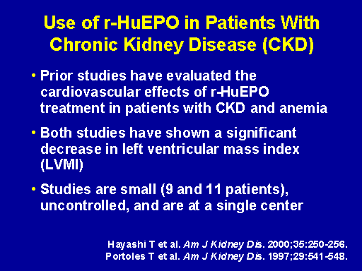Two small studies looking at the cardiovascular effects of treatment with erythropoietin in patients who have anemia and chronic renal insufficiency. These studies were small, uncontrolled and single center. But they did, however, both find a significant decrease in left ventricular mass index as measured by echocardiography in the treatment group. In other words, patients who received erythropoietin had improved left ventricular mass index as compared with the control group.