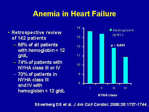Some data that Donald Silverberg looked at. He reviewed 142 patient charts. These patients all presented to a specialized CHF clinic at his center. This was a fairly sick population of patients with about 74 percent of these patients having New York Heart Association Class III and IV heart failure. Fifty-six percent of all patients had hemoglobin less than 12 percent, 12 g/dl, and 70 percent of patients, of patients who were Class III or IV heart failure had hemoglobin levels less than 12 g/dl. If you look at this slide here, on the x-axis is New York Heart Association Class and on the y-axis is the hemoglobin level. You'll see that as New York Heart Association Class gets worse, between Class I, II, III and IV, there is a progressive decrease in the mean level of hemoglobin. And this is statistically significant.