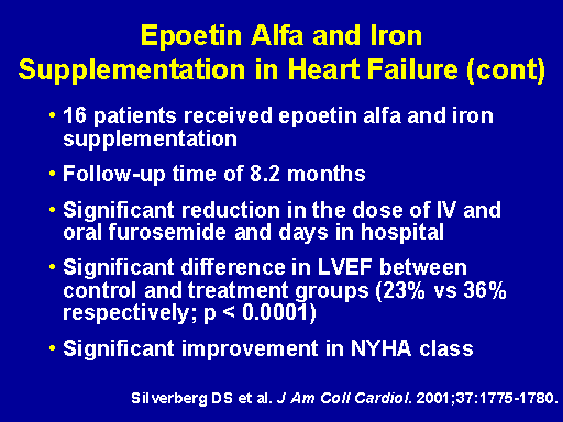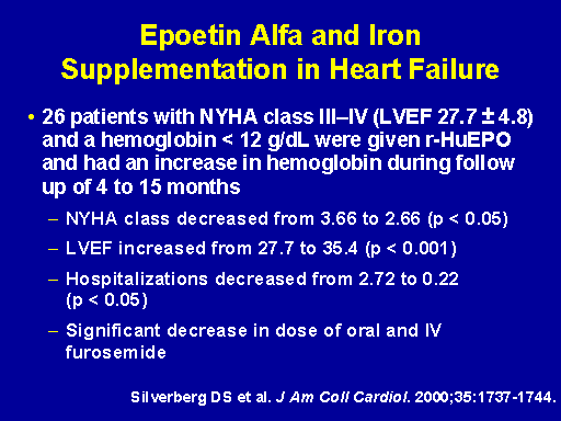 Dr. Silverberg than took 26 patients, all with fairly bad heart failure, New York Heart Association Class III and IV, low ejection fractions and anemia and treated them with erythropoietin in order to achieve a target hemoglobin of 12 grams per deciliter. Now, I'll tell you, this is not controlled data but is interesting nonetheless. He found that there was a statistically significant decrease in New York Heart Association Class from 3.6 to 2.6. There was also an increase in left ventricular ejection fraction from 27 percent to 35 percent, also statistically significant. Hospitalizations decreased and there was a decrease in the use of oral and IV furosemide in these patients. So interesting data but there was no control group in this population.