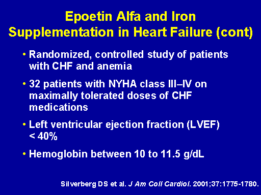 He followed up with a small study where he had a randomized controlled study of 32 patients, all with pretty severe heart failure, Class III and IV heart failure, on maximal doses of heart failure medications, including ACE inhibitors, in some case beta blockers, and spironolactone. All of the patients had low ejection fractions less than 40 percent and hemoglobin levels were between 10 and 11.5 g/dl
