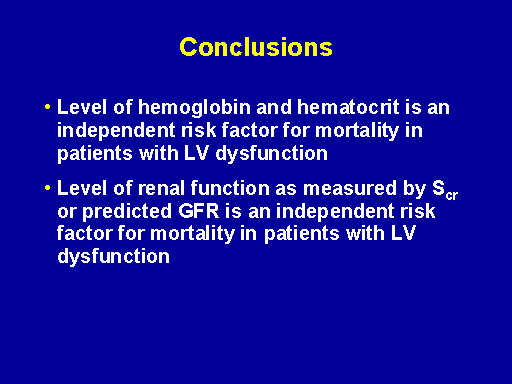 So in conclusion, the level of hemoglobin and hematocrit is an independent risk factor for mortality in patients with left ventricular dysfunction. The level of renal function as measured by serum creatinine or predicted GFR is also an independent risk factor for mortality in these patients.