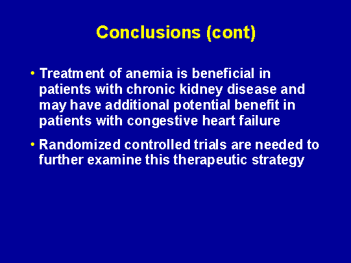 Treatment of anemia is beneficial in patients with chronic renal disease and may have additional potential benefit in patients with congestive heart failure. However, randomized controlled trials are needed in order to further examine this therapeutic strategy in patients with heart failure. Thank you.
