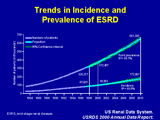 This figure taken from the USRDS 2000 annual report is I'm sure familiar to many, if not all, of you. And what it shows is that over the last two decades we've had a steady inexorable increase from year to year in the numbers of new patients who start end stage renal disease or renal replacement therapy. And the other point on this slide is that parallel to the increase in new patients there's been an increase in the prevalent patient population, the numbers of individuals on dialysis at any one particular point in time. If this epidemic increase in incidence continues to occur unabated we're going to see a 50 to 100 percent increase over the next decade in the numbers of new patients starting dialysis. That, in turn, is going to continue to drive the increase in the prevalent population and that aggregate increase in new and existing patients is going to stress the ESRD infrastructure, the nephrology manpower and the financial resources of the Medicare trust beyond anything that we can sustain. And so we have to look at ways to address this epidemic.