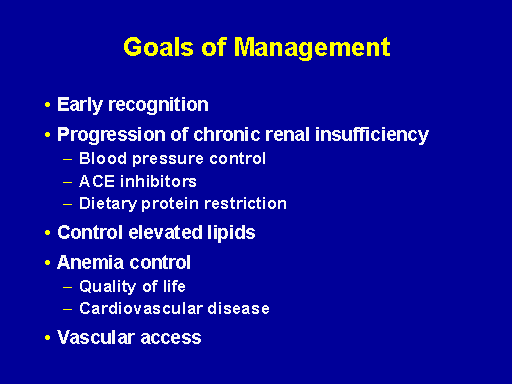 Essentially we realize that early recognition of renal injury at a time when we can bring therapy that will effectively stop or at least delay progression is an essential component to this. And this is why we're interested in where these prevalent populations of high risk patients are. When we find them we need to do things to reduce the rate of progression of the chronic kidney injury and that today means tight control of blood pressure, preferential use of an angiotensin converting enzyme inhibitor, particularly in proteinuric patients. And if progression is continuing despite good blood pressure control and ACE inhibition, at least a consideration for dietary protein restriction.
