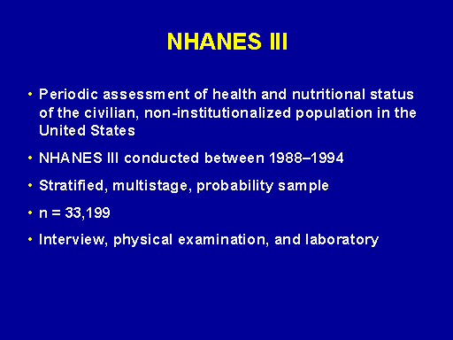 And our information about what's going on in the general population comes from the National Health and Nutrition Examination Surveys. NHANES III is the last completed survey. There's now NHANES IV that is ongoing. And all of the NHANES studies are designed to give us a representative picture of health and disease in the U.S. population. NHANES III was conducted between 1988 and 1994. It was a random sample of the U.S. population. Over 33,000 individuals participated in a history, physical examination and laboratory tests.