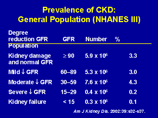 And when we look at the prevalence of chronic kidney disease in this population using the stratification that has been suggested by K/DOQI and reviewed by Dr. Bolton what we find is that there's a substantial prevalence of mild to moderate and severe chronic kidney disease in the U.S. population. Now, what I want to do is I want to focus on these moderate to severe patients for a minute because these are the individuals in whom we should be focusing not only our intensive efforts to delay progression but also our attention to anemia treatment and vascular access preparation and so forth. And you can see that between 60 and 30 ml per minute defines moderate decrement in GFR, 30 to 15 ml severe decrement in GFR. And this constitutes about four and a half percent of the U.S. population.