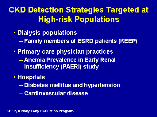 The first group, the family members of our dialysis patients we have looked at in Georgia through the National Kidney Foundation Kidney Early Evaluation Program. The KEEP program is a screening program that's being conducted by the NKF through the United States and perhaps some of you in your states as well have participated in it. In Georgia we targeted our KEEP screening at ESRD family members by going to dialysis facilities in ten small cities around Georgia and asking the social worker and the nurses in those dialysis facilities to recruit family members to come in voluntarily for a screen that was conducted either at the dialysis facility site or adjacent to it.