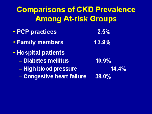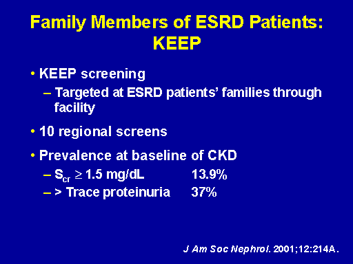 And in those ten regional screens we found that family members who walked through without any preconceived notion about what they were going to receive other than some blood test, 14 percent of them had a serum creatinine greater than 1.5 milligrams per deciliter. This is roughly a three to four fold increase over the prevalence of chronic kidney disease in the U.S. population as defined by NHANES III. Further, one plus or greater proteinuria was present on a random dipstick in 37 percent of this dialysis patient family population. NHANES III found that about one percent of the population had one plus or greater proteinuria. That is, microalbuminuria, macroproteinuria. So this is a substantial increase in the prevalence of proteinuria over what's being observed in the general population. So one potential target population for programmatic activities might be the dialysis patient's family members.