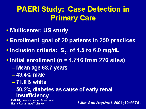 A second population that is of considerable interest are those patients who are seen by the primary care physician. And these are data from the Prevalence of Anemia in Early Renal Insufficiency Study which is looking at case detection in primary care practices. And what we've done in this multicenter study is sequentially screen patients in over 250 primary care physician practices with a few nephrology and endocrinology practices throw in to leaven the mix. But nonetheless these practices were screened until at least 20 patients with a serum creatinine between 1.5 and six milligrams per deciliter were identified and included in the study.