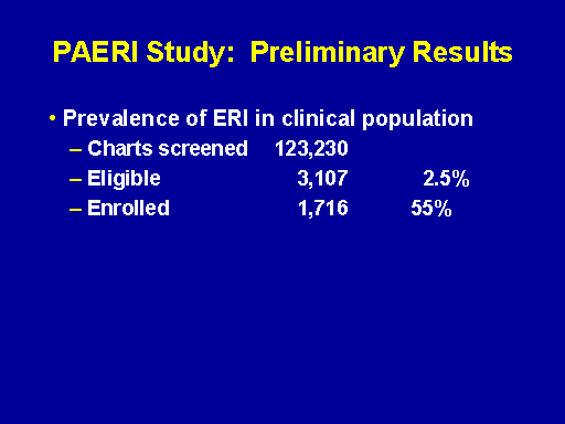 In this early cut at our data ... and we'll soon have a finished report from this study ... of the 123,000 charts that had been systematically screened just over 3,000 or two and a half percent of the patients in the primary care physician's practice had chronic kidney disease as defined by our inclusion criteria. Now, this is actually a lower prevalence than we would expect for moderate and severe kidney disease on the basis of the NHANES III data.