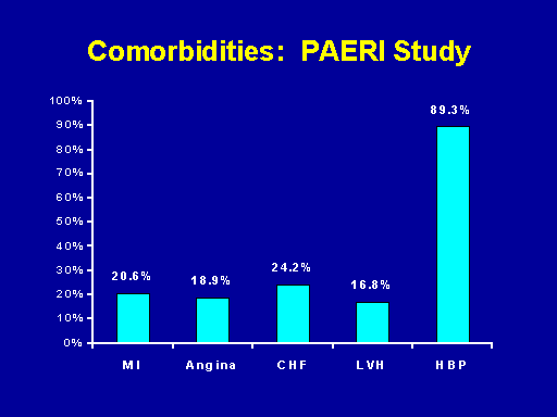 The important point from the PAERI study, however, is that if a patient in a primary care physician's practice does indeed have chronic kidney disease they have the sorts of complications and comorbid conditions that Dr. Bolton indicated to you was a problem for this population. For example, this is the prevalence of cardiovascular disease in the PAERI cohort participants. And you can see that one in five individuals had a history of myocardial infarction, angina pectoris, heart failure and 17 percent had recorded evidence in their charts of left ventricular hypertrophy. Now, these are not mutually exclusive categories and some people may have had both angina pectoris and heart failure. But the point is there's a substantial burden of cardiovascular disease in these patients with chronic renal insufficiency in primary care. Ninety-seven percent of them, in turn, were hypertensive. So that they clearly are ill.