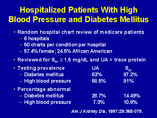 1. McClellan WM, Knight DF, Karp H, Brown WW. Early detection and treatment of renal disease in hospitalized diabetic and hypertensive patients: important differences between practice and published guidelines. Am J Kidney Dis. 1997 Mar;29(3):368-75.