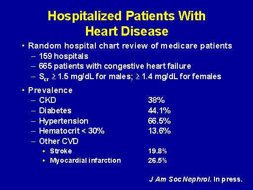 This is a study that we did just recently. It was actually in response to some data that you're going to hear, some very important data that you're going to hear later on in this program where we looked at the prevalence of chronic kidney disease in hospitalized patients with heart disease. And in this study in Georgia again and all of the general medical surgical hospitals we randomly selected patients who had congestive heart failure. And in these 665 patients we did a chart review to see if they had a serum creatinine of 1.5 or greater for males and 1.4 milligrams per deciliter or greater for females.