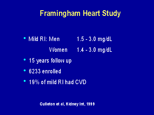 Now, one of the beliefs of people in treating patients with chronic kidney disease is that this is an atherogenic state. I'm going to discuss whether in fact it is an atherogenic state per se or whether it's just a marker for increased risk because of underlying cardiac diseases. The Framingham study investigated 6,233 people enrolled in a community study with 15 years follow-up. Of those people in the study about eight percent had a raised serum creatinine at these levels for men and for women, and of those people with renal insufficiency 19 percent had cardiovascular disease.