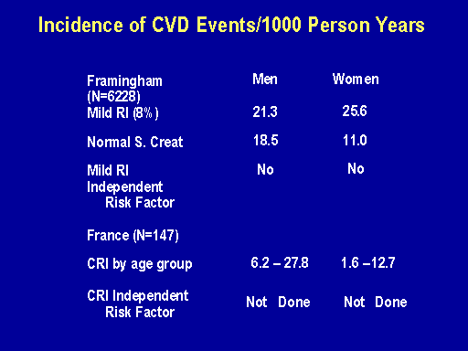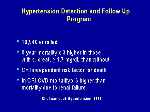 Now, the Framingham data has been confirmed by the NHANES data and by the MRFIT data that renal insufficiency in community studies is not a risk factor for subsequent primary events. However, in cohort studies where there's a higher degree of comorbidity such as this hypertension detection follow-up program in which 11,000 people were enrolled, there was clear evidence for increased cardiovascular mortality, three fold higher in those with a raised serum creatinine than those without. Similarly this evidence is being confirmed in studies of the elderly and in studies of coronary patients, cardiac patients.
