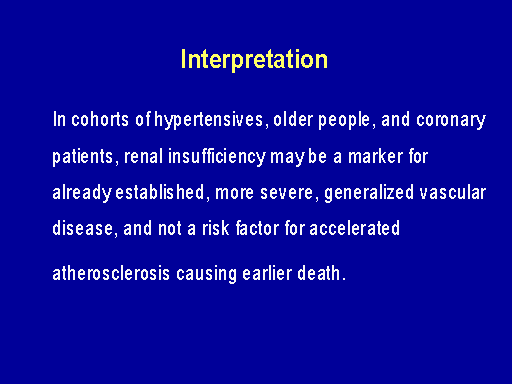 The HOPE study as well was an important study that demonstrated that renal insufficiency was an independent risk factor for subsequent cardiac events. However, the interpretation may well be that in cohorts of hypertensives, older people and primary patients where the baseline comorbidity is quite high, that renal insufficiency may be a marker for already established, more severe generalized vascular disease and not a risk factor for accelerated atherosclerosis causing cardiac death.