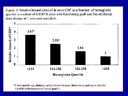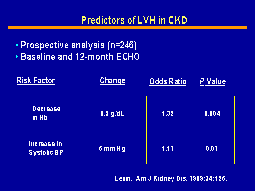 And the risk factors that were identified for increased left ventricular growth defined as a 20 percent increase or 20 grams per square meter increase were anemia, in which there was a 30 percent increased risk for LV growth per 0.5 grams per deciliter decrease in hemoglobin from normal. Blood pressure was also seen to be a risk factor. There was a 10 percent increase in LV growth for each 5 millimeter of mercury rise above the normal level and that was independent of the underlying left ventricular mass index.