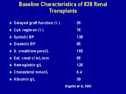 Now, this data that I'm going to show you is in press in JASN and what it examines is 638 renal transplant recipients who have been transplanted for one year and they're in fact every patient transplanted in two Canadian provinces, Manitoba and Newfoundland. These renal transplants had no cardiac disease at the start of the study that we did. Here are the baseline characteristics at one year: the majority were on cyclosporin, blood pressure as 138 over 85, creatinine was 160 micromoles per liter which is about 1.8 milligrams per deciliter according to what you have in the United States. The estimate creatinine clearance was 55 ml per minute, the hemoglobin was 126 grams per liter and the albumin was 39 grams per liter.
