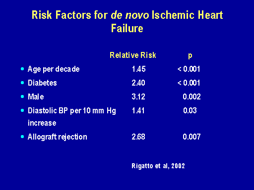 The risk factors for de novo heart failure independent of age, diabetes and gender, included high blood pressure and allograft rejection but did not include anemia.