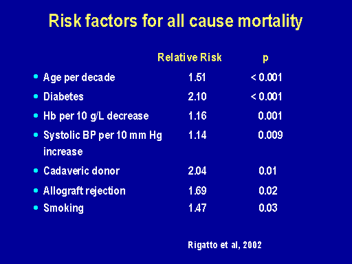 Audience member: In the transplant study, cadaveric transplants seemed to be a risk factor. Was that related to the renal function of the cadaver versus living related transplants? Or do you have any other explanation?