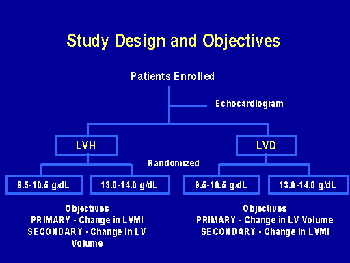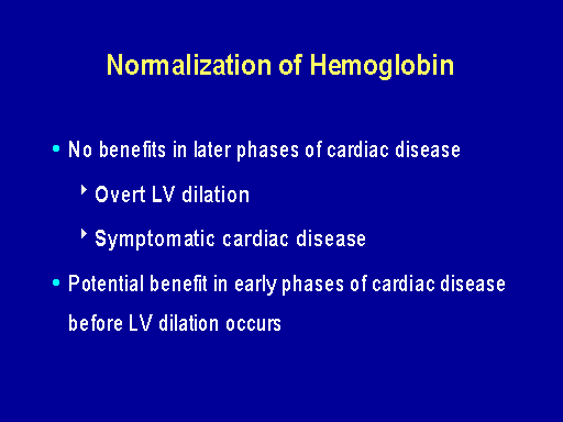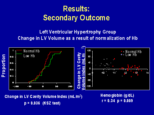 So we concluded from that trial that normalization of hemoglobin does not induce regression of concentric hypertrophy or LV dilatation. It prevents progressive LV dilatation in patients with normal left ventricular volumes and it may improve some dimensions of quality of life. So taken together with the Amgen study we felt that the utilization of erythropoietin to normalize the hemoglobin level should be tested in patients at the earlier phases of their cardiac disease. And such studies are in progress including one in patients starting dialysis, a large study which will be reported next year which has got echo outcomes and quality of life outcomes. Donal Reddan is going to discuss the American study that's planned and there are some studies in Europe that are investigating this.