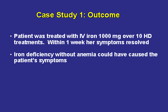 What we did in our patient was treat her with IV iron. Those days, we had iron dextran, and I gave her a gram of iron dextran over ten dialysis treatments. And within a week, she was feeling great. An iron deficiency without anemia could have caused the patient's symptoms. You might say that it was a placebo effect, but, even if it was a placebo, it worked for the patient.