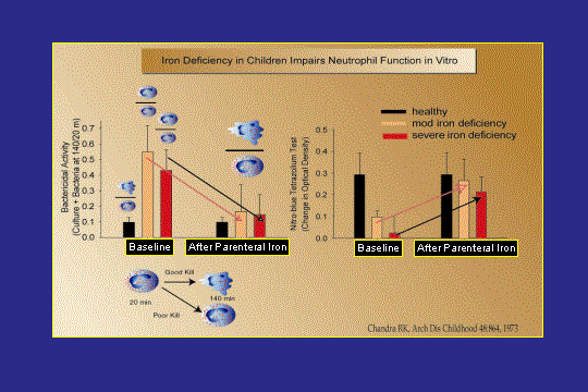 So you can see that in these two groups, bacterial killing was impaired; e.g., in children with moderate iron deficiency or those with severe iron deficiency. They have a lot of bacteria remaining at 20 minutes, compared to this control group of children. And when you treat them with IV iron, they have very few bacteria (remaining on the bacterial killing test) after a week of IV iron. The oxidative burst, which is a test of neutrophil function, is quite impaired at baseline, very low compared to the LD controls. But after you give them IV iron, neutrophil function is similar to that in controls. In other words, you need iron to have the adequate performance of neutrophil function. You have to mount a response to kill the bacteria and also to operate the oxidative machinery to do that. And here's a benefit of giving intravenous iron.