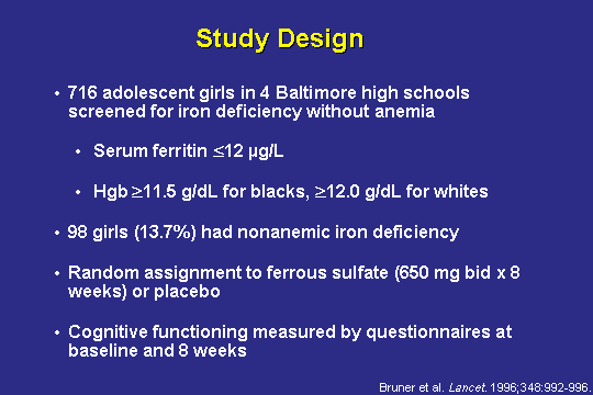 First we'll talk about the cognitive function. Here's a study which was done in Baltimore on adolescent girls in four Baltimore high schools. The investigators went around and screenet for iron deficiency without anemia. The serum ferritin was less than 12 ng/mL. The hemoglobin was more than 11.5 g/dL for blacks, more than 12 g/dL for whites. Actually, these groups had iron deficiency without anemia, because the hemoglobin was in the normal range. But they're iron deficient. And 98 girls had nonanemic iron deficiency, about 15%. In other words, the hemoglobin was normal, but the iron was low. And then they randomly assigned these 98 girls to either ferrous sulfate by mouth or placebo, and they measured cognitive function by standard questionnaires at baseline and at eight weeks.