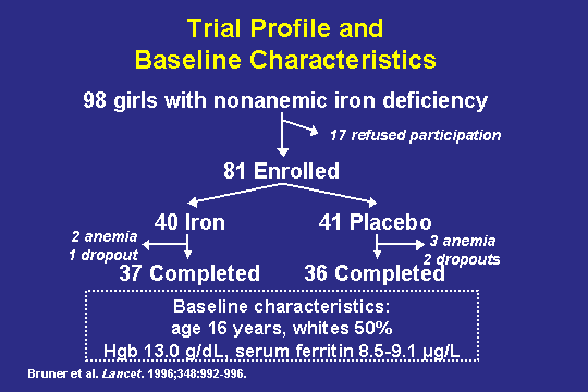 So here are the 98 girls that are identified, 17 refused participation. 81 enrolled. Forty were randomized to iron and 41 to placebo. A fair number of them, 90+ percent, completed the trial. They are teen age girls, 16 years, 50% are whites, and hemoglobins average 13 and the ferritins average 9. The maximum is 9.1. By anybody's definition, they're quite iron deficient, but they have a normal hemoglobin.