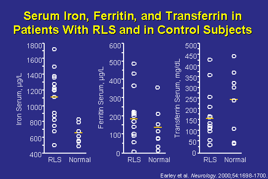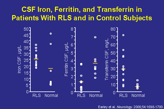 - Earley CJ, Connor JR, Beard JL, Malecki EA, Epstein DK, Allen RP. Abnormalities in CSF concentrations of ferritin and transferrin in restless legs syndrome. Neurology. 2000 Apr 25;54(8):1698-700.