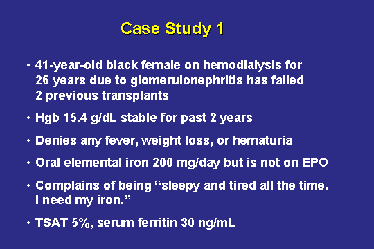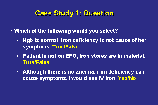 And then I had a question in my mind. Her hemoglobin is 15.4. But her labs look iron deficient. What should I do? What would you do in this patient?She has a normal hemoglobin and iron deficiency is not a cause of her symptoms. How many people would think that? I was one who was thinking that. I'll be honest. A patient is not on EPO, iron stores are immaterial. Well, in part, that's true, because if you look at the package insert for any of the intravenous iron products, they say the patient has to be on EPO to qualify for this therapy, at least in dialysis patients. Or, although there's no anemia, iron deficiency can cause symptoms, I would use IV iron. Hopefully you'll say "yes," at the end of the talk, but I was thinking more like, one, hemoglobin is normal. Iron doesn't matter.