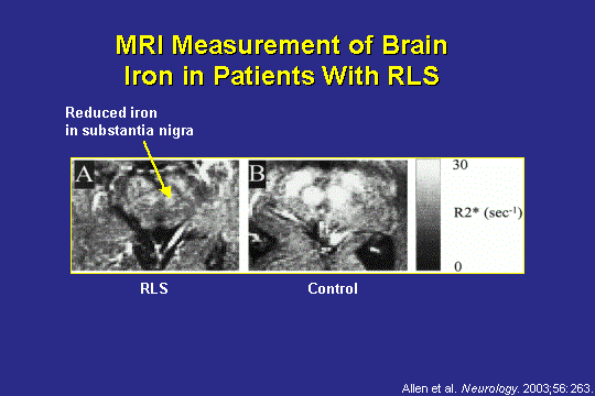 If you do even more sophisticated imaging studies in which you actually look at iron concentration in the substantia nigra, which is supposed to be the culprit that's supposed to be mediating movement disorders, you can see that there are a lot of white areas in the control, which tells you that there is a fair amount of iron. This is a specific test for iron imaging in the brain. Which lately has gotten a lot of interest in neurology. And you can see there's a lot of white out here in the control people, and in the patients with restless leg syndrome, there's actually reduced iron. Which suggests that it's really a state of regional iron deficiency. The fact that they don't have enough iron in the substantia nigra is the reason why they have restless leg syndrome.