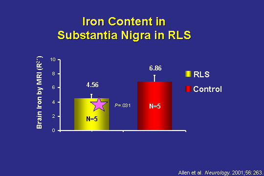 But if you sample their cerebrospinal fluid, and you measure the same parameters, you find that CSF iron in the restless leg syndrome is actually higher. The CSF ferritin is markedly lower. And the CSF transferrin saturation is also higher. So the saturation if you calculate the ratio, actually comes out low. And the ferritin is definitely low in the CSF of the patients with restless leg syndrome.