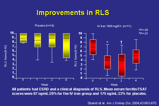 - Sloand JA, Shelly MA, Feigin A, Bernstein P, Monk RD. A double-blind, placebo-controlled trial of intravenous iron dextran therapy in patients with ESRD and restless legs syndrome. Am J Kidney Dis. 2004 Apr;43(4):663-70.