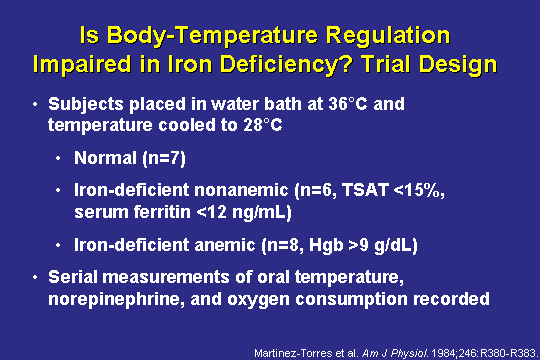 - Martinez-Torres C, Cubeddu L, Dillmann E, Brengelmann GL, Leets I, Layrisse M, Johnson DG, Finch C. Effect of exposure to low temperature on normal and iron-deficient subjects. Am J Physiol. 1984 Mar;246(3 Pt 2):R380-3.