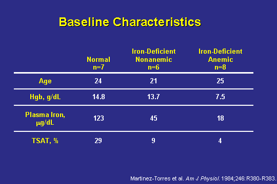You can see here the normal individuals and the iron-deficient, nonanemic individuals and anemic individuals. They're about the same age. Young people. Probably got paid a little bit to do the study. Hemoglobin is pretty low here. And these people are clearly iron deficient. Here the numbers look quite similar.