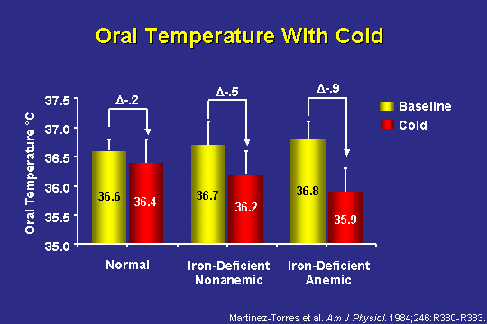 If you look at the oral temperature, the temperature drops, even in people who have normal hemoglobin. Drops a little bit. But, if you are nonanemic iron deficient; e.g., if you have a normal hemoglobin, but you are iron deficient, or you are anemic and iron deficient, it doesn't matter, your temperature drops much more than in the control patients.