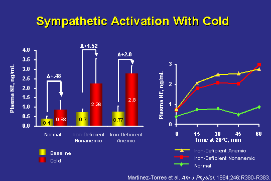 If you look at these two graphs, you find that these two measures look very similar, while this one looks different. And that's the plasma norepinephrine. The epinephrine response is much more robust in iron-deficient, nonanemic and iron-deficient anemic individuals compared to normals. And you can see, this response and this response are no different, but this looks different, so they are having a much greater catecholamine response. And on this side, I've just shown you the time course at 15 minutes, 30 minutes, 45 minutes. One hour. Lastly, when they are taken out off this cold water baththey have quite a stimulated catecholamine release. In fact, it doesn't matter whether they are anemic or not anemic. If they are iron deficient, they have the same kind of an increased surge in catecholamines at one hour after cold exposure.