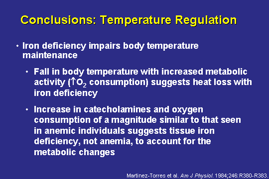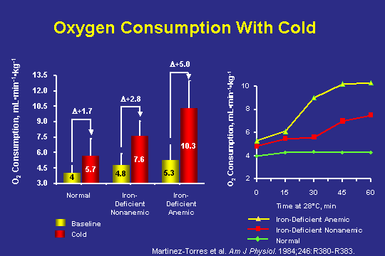 What this means is, that if you have a falling body temperature, and you have an increase in metabolic activity, which means that you have an increase in oxygen consumption, it suggests there's heat loss with iron deficiency. So your temperature dropped despite an increase in metabolic activity. Your oxygen consumption had increased. That means you are losing heat. And you're not losing heat for any other reason. Probably it suggests that there's some defect in the mitochondria of these individuals by which there's uncoupling of oxidative phosphorylation. There's increase in catecholamines and oxygen consumption, which is similar in anemic or nonanemic individuals who have tissue iron deficiency, not just anemia. So you might say, okay, if you have anemia, then you are vasodilated and you'll dissipate heat. But that's not true. The nonanemic individuals are doing it as much. It seems like it might be a utilization of energy which might be at fault rather than anemia, as such.