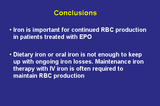 To conclude, iron is important for continued RBC production in patients treated with EPO. We know that quite well. Everybody in this room does. Dietary iron or oral iron is not enough to keep up with the ongoing iron loss, especially when you're treated with EPO. And we need maintenance IV iron therapy to maintain RBC production.