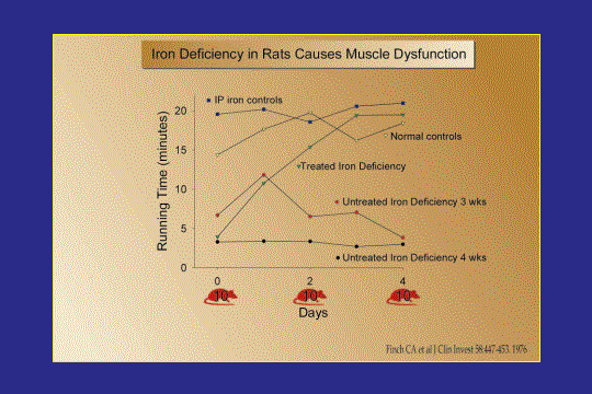 And you can see this curve, right at the bottom, that's untreated iron deficiency for four weeks. The rats can't run. They fall off the treadmill within three minutes, whereas a normal rat can run nearly 20 minutes. More than some people in the room can run. It is doing pretty good. Whereas the untreated iron deficiency is not doing too good. But you treat the iron deficiency and you maintain the hemoglobin, they can do pretty well.