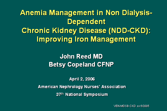 Thanks to ANNA and to American Regent for your sponsorship. It is always a pleasure and an honor to be with the nurses. I think this group multitask better than anybody in any medical industry, and hats off to you for what you do everyday for our patients. Betsy and I will talk with you today about a new direction that we have taken in our iron management in the CKD or predialysis area and for definition purposes where you see the NDD (non-dialysis-dependent), we are basically talking about predialysis patients.